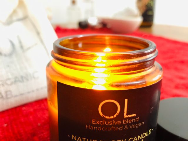 Vela 100% orgánica con aceite de soja, manteca de cacao, manteca de karite y aceite de almendras.